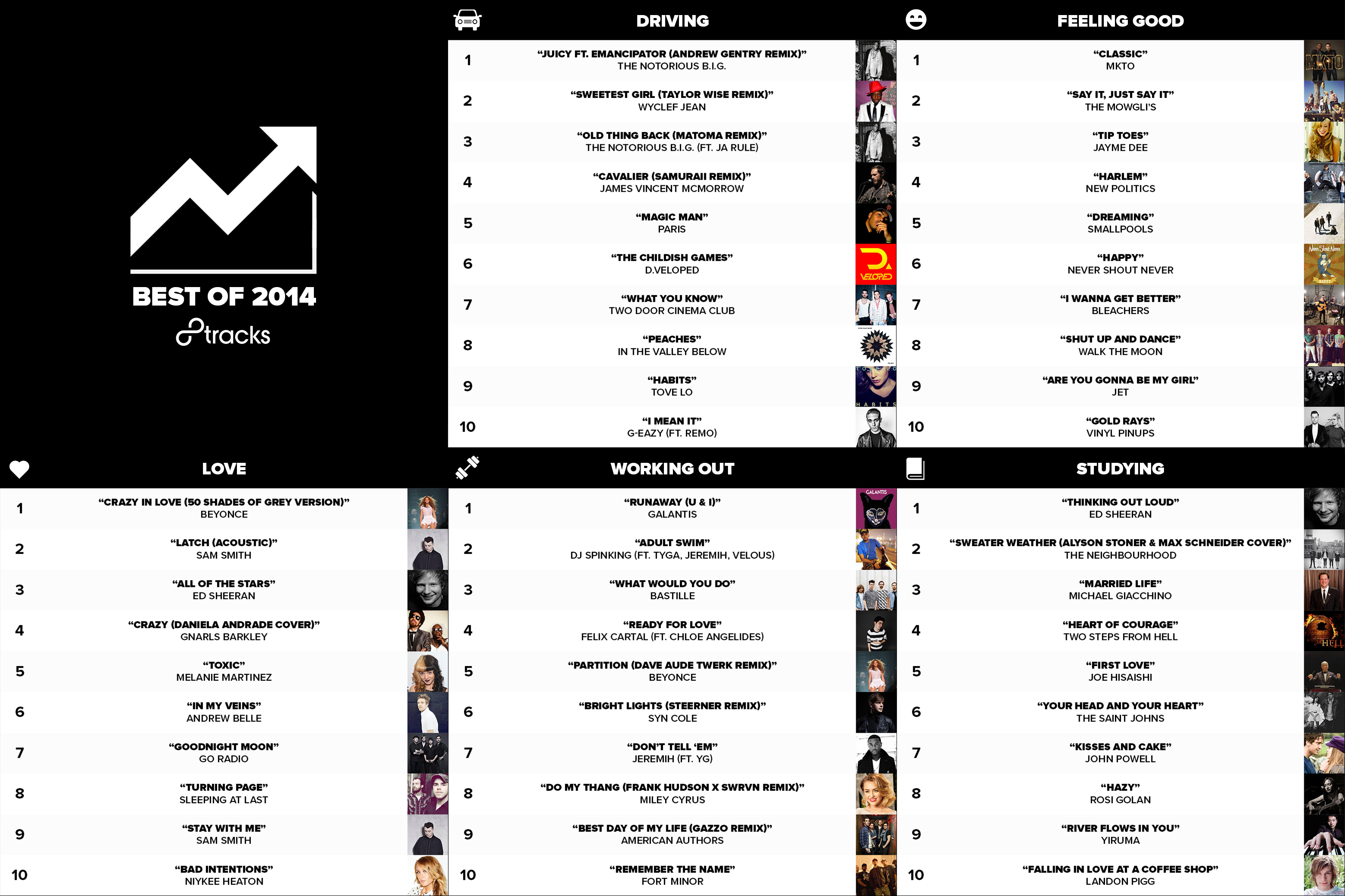 Looking across tens of thousands of playlists for popular tags like driving, feeling good, working out, studying and in love, we found the top 10 songs that our listeners shared and enjoyed the most for each respective tag in 2014.